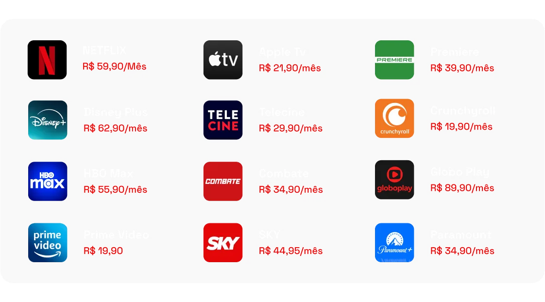 Unifique sua diversão. Tenha acesso aos catálogos da Netflix, HBO Max, Disney+, Prime Video e muitas outras plataformas, tudo em uma única assinatura.